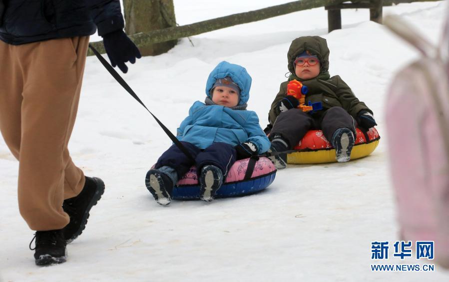 1月24日,孩子们在白俄罗斯首都明斯克郊区的民族建筑博物馆内乘坐滑雪气垫圈,感受雪趣。