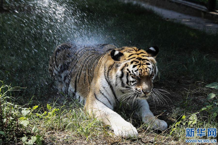 7月13日,郑州市动物园的一只老虎正在喷淋降温。