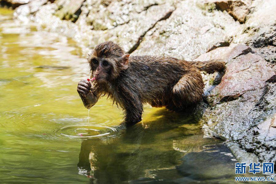 7月13日,郑州市动物园的一只猴子在水边玩耍。