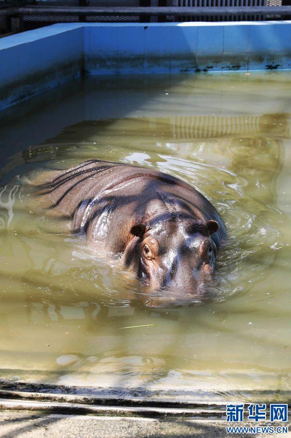 7月13日,郑州市动物园的一只河马在水中享受清凉。