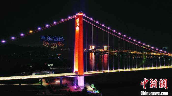 7月31日晚,湖北省宜昌市在伍家岗长江大桥上空举行了一场“秀美宜昌”灯光秀无人机表演。伍家岗长江大桥是宜昌市新修建成的第九座长江大桥,闪耀夜空的大桥灯光秀结束后,500架无人机在夜空中变换出不同文字和图案,并致敬劳动建设者。