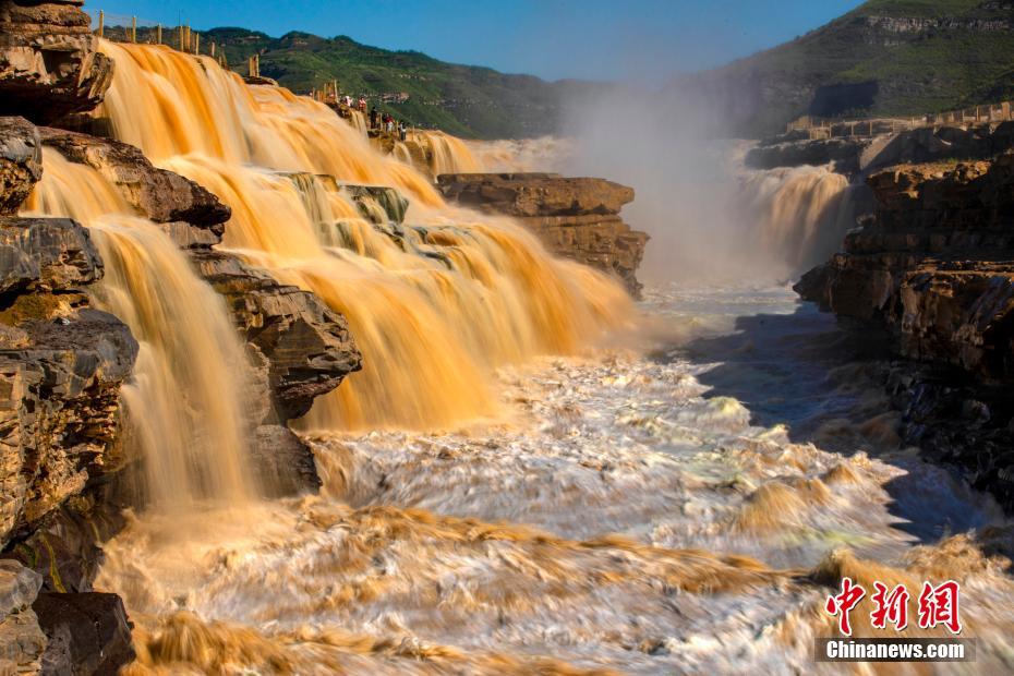 近日,位于秦晋峡谷的黄河壶口瀑布进入秋汛最佳观赏季,河水量大增,水流携带大量泥沙奔腾而下,瀑布群连成一片,主瀑布溅起数十米的巨大水雾,涛声震耳如雷,十里龙槽“金”涛拍岸,波涛汹涌,整个瀑布呈“金黄色”,引来众多游客观赏拍照。图为奔腾咆哮的瀑布。 兰华 摄