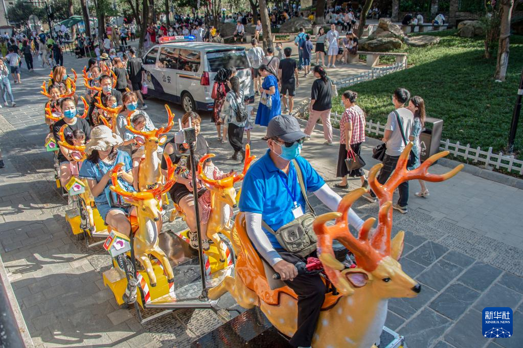 10月5日,游客在黄鹤楼观光游览(无人机照片)。 国庆长假期间,不少市民、游客前往武汉各个景点游玩,欢度假期。 新华社发(伍志尊 摄)