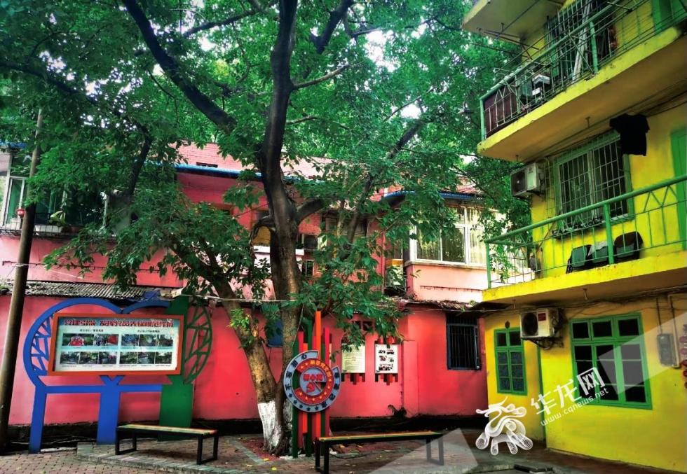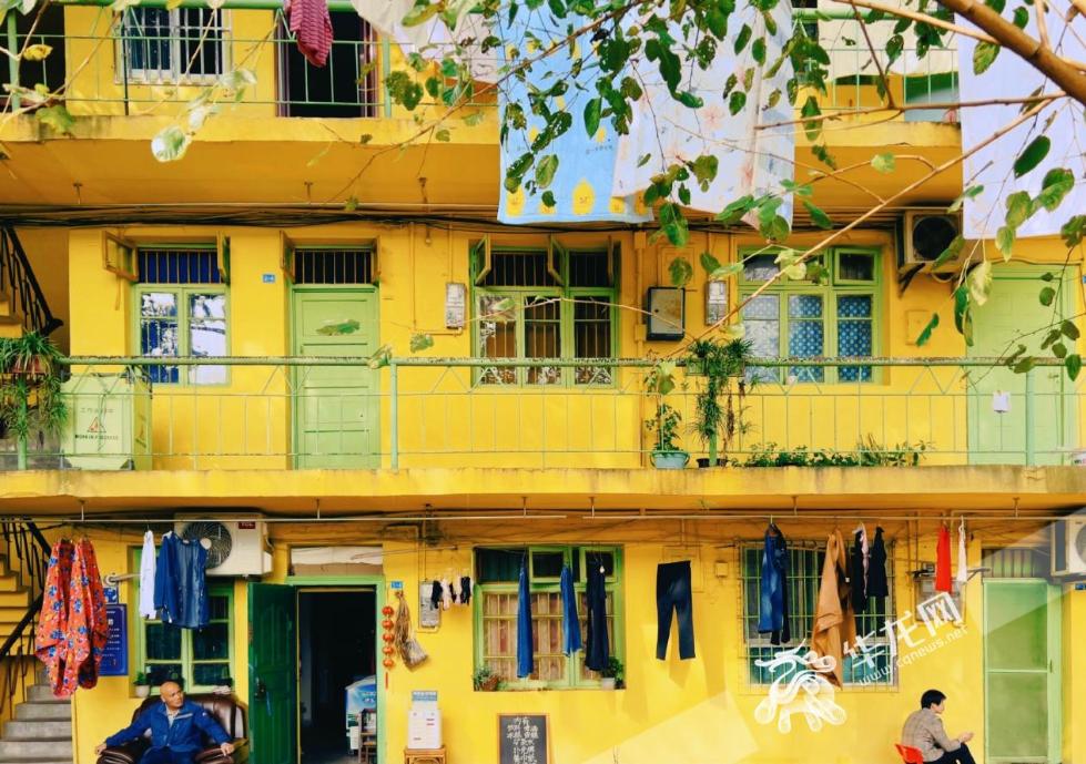 沙坪坝石井坡“童话屋”以前是老旧的居民楼,经过改造才有了现在五彩斑斓的样子,粉红、青绿、薄荷绿、淡紫、鹅黄……一栋栋房子呈现出各种极具冲击力的色彩,每栋房子墙面统一颜色,窗台、门面是另一个颜色,搭配极美。