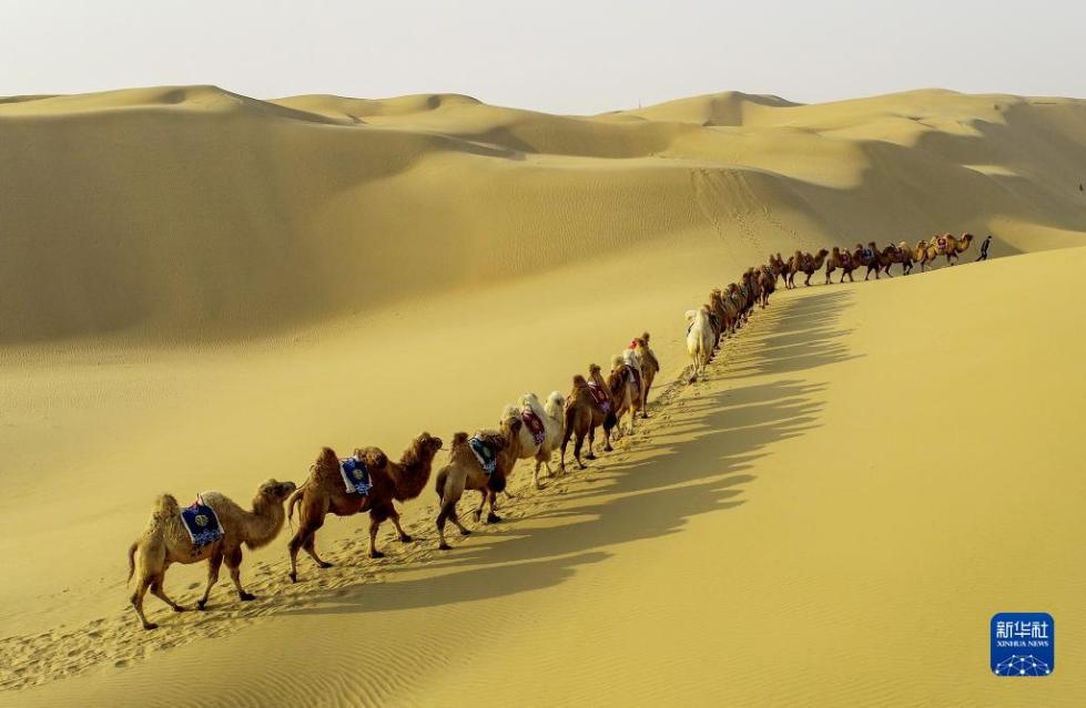 冬日,位于内蒙古自治区鄂尔多斯市的库布其沙漠壮美而静谧,驼队行走其中,构成一幅沙海画卷。