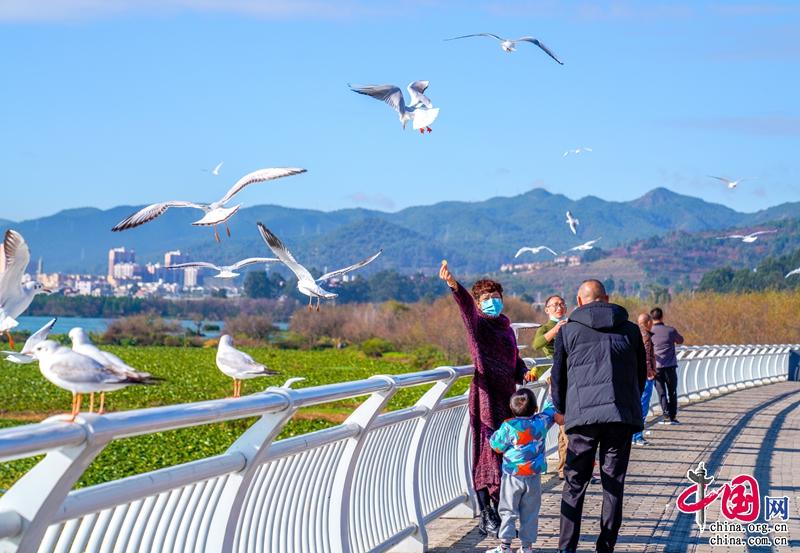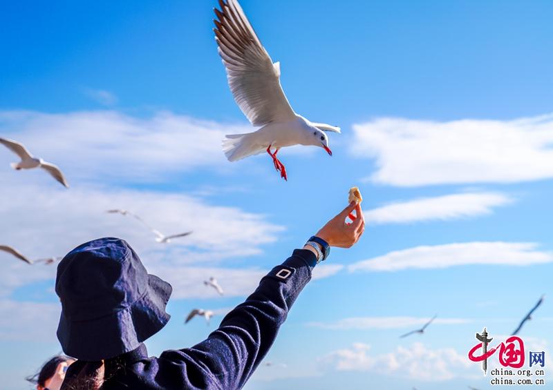 这几天,人们步行来到观景台,享受着温暖的阳光,与海鸥来一次最亲密的接触,是冬日里最快乐的时光。