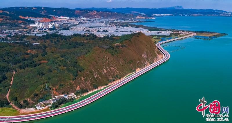 行走在位于滇池南岸的临水景观路上,由于靠近滇池一侧桥面比靠路一侧平均低1.2米,在双向车道上都可以无障碍观赏滇池湖景。这条双向4车道的景观路,还专门设计了骑行道和慢行步道,运动过程中,可以任意驻足拍摄滨水景观,许多人会专程驾车来到这里观光,这条路因此被称为“最美环湖公路”。