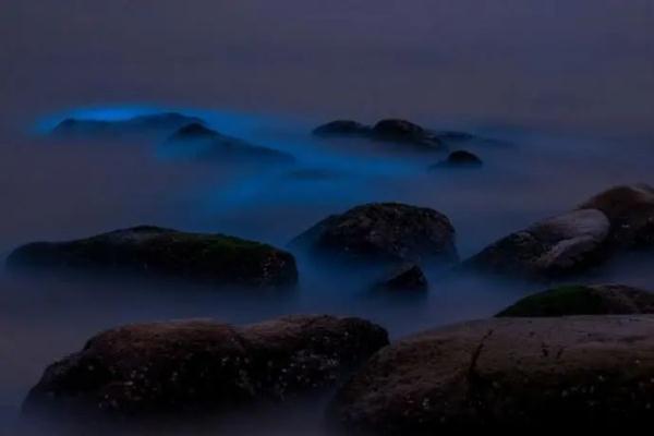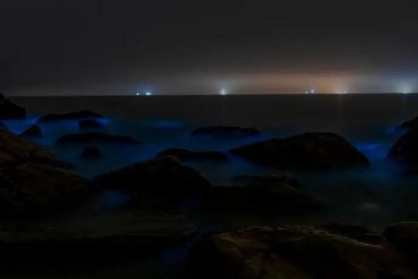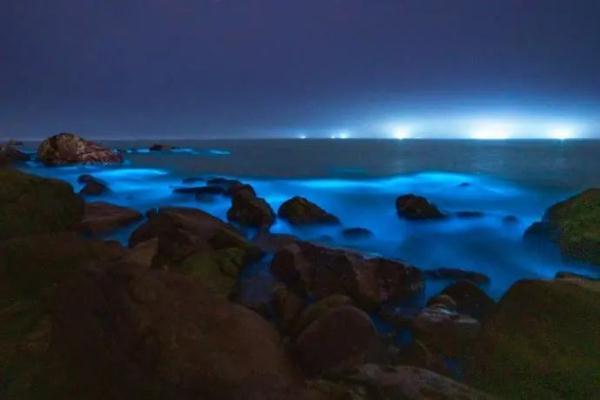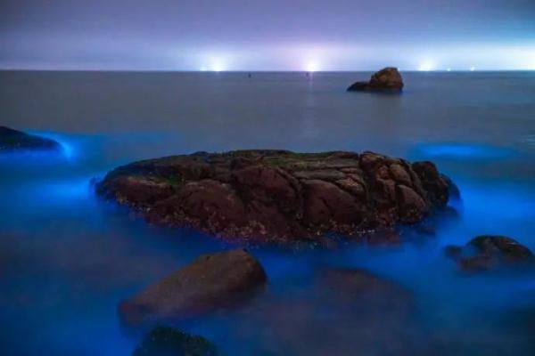 每年春季气温回升,光照充足,海洋藻类快速繁殖,其中夜光藻等发光生物繁殖聚集引起发光现象,“夜光藻”受到海浪拍打等强烈扰动时,会产生浅蓝色的光。