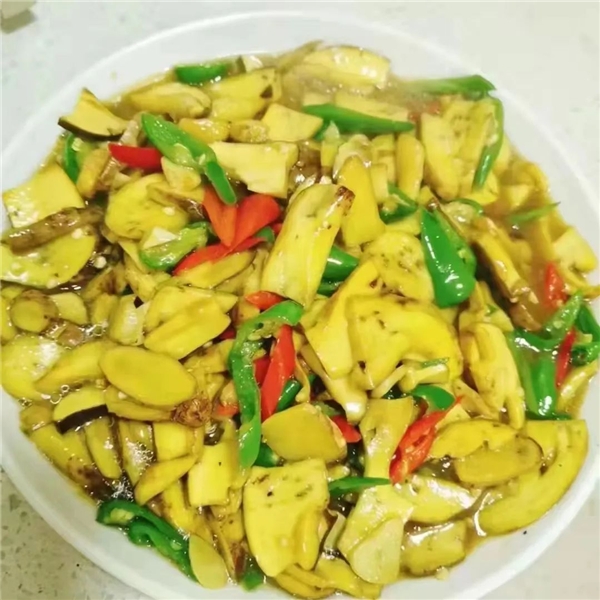 用产于高海拔、低纬度的桂东深山老林之中,无法人工培育、完全野生的黄菌切片爆炒,只配鲜姜、蒜、辣椒,保留最始原味鲜味。具有肥厚滑溜,嫩脆甜香,色泽养眼的特点。喻万事顺意。