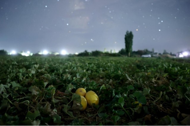 2023年7月21日,在新疆哈密伊州区南湖乡拍摄的星光之下的成熟哈密瓜。(王俊峰摄)