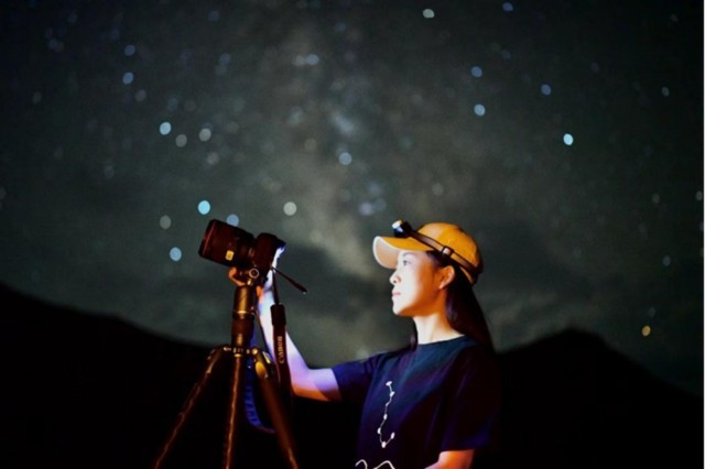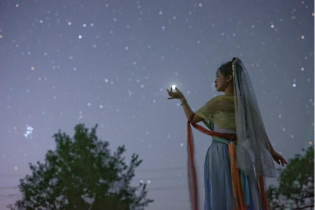 2023年7月20日,在新疆哈密伊州区南湖乡,一名汉服爱好者和星空“合影”。(王凯 摄)