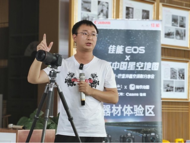 2023年7月17日,在新疆哈密巴里坤高家湖,青年星空摄影师戴建峰在星空摄影课堂上为爱好者分享星空拍摄技巧。(周博 摄)