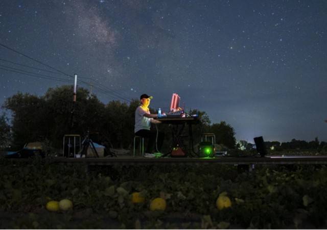 2023年7月21日,直播团队在新疆哈密南湖乡瓜田进行星空专题直播。(孟凡程摄)