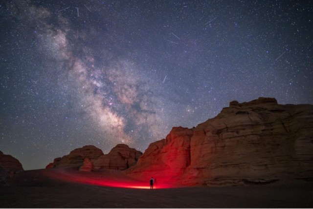 2023年7月20日,星空摄影爱好者在新疆哈密魔鬼城记录夏日星空。(戴建峰摄)