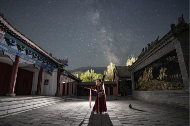 2023年7月17日,在新疆哈密巴里坤古城,一名汉服爱好者和星空“合影”。(周博摄)