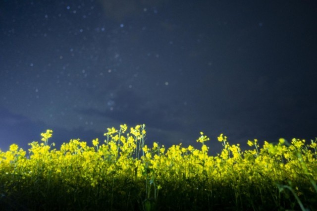 2023年7月18日,在新疆哈密巴里坤松树塘拍摄的盛开的油菜花和夏日星空。(周博 摄)