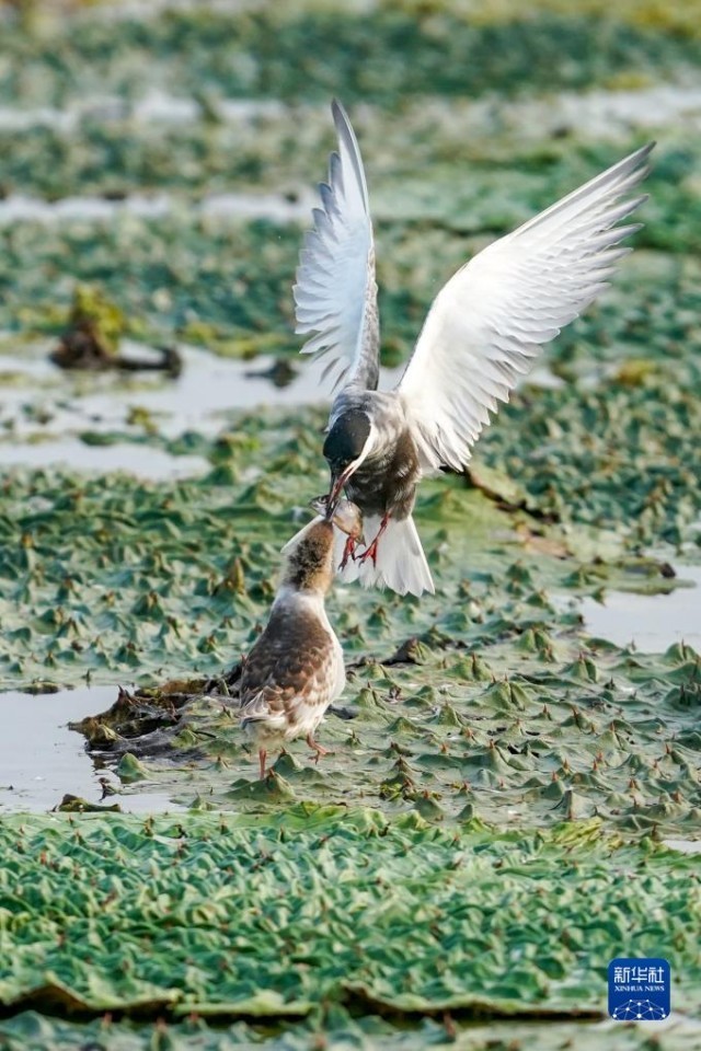 在江苏省盐城市建湖县九龙口国家湿地公园内,须浮鸥衔着小鱼给幼鸟喂食(9月7日摄)。
