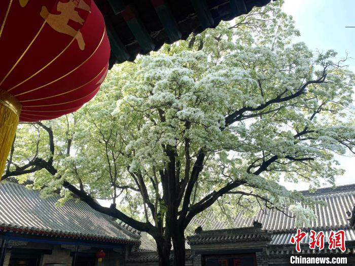在山东济宁邹城市的孟府景区,赐书楼前植于清代、生长300余年的两棵流苏树迎来盛花期。一簇簇流苏洁白如雪,白色的花细长如丝,绿色的叶满目滴翠。摇曳在屋檐下的枝条与古建筑相互辉映,为这座有千年历史的庭院,增添了浓浓的诗情画意。流苏树是木樨科植物,每年4月开花,如覆霜盖雪,花香浓郁,又称“四月雪”。