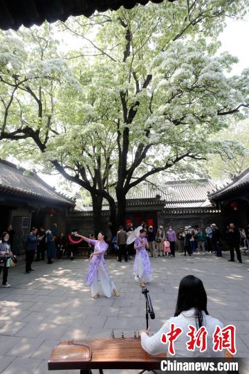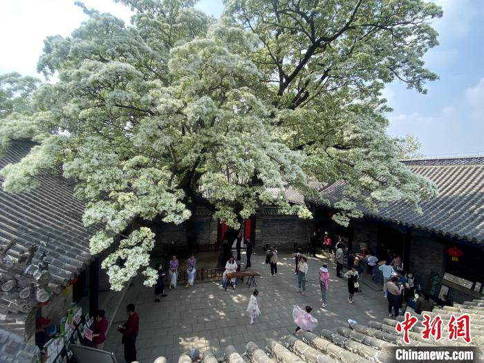 4月12日,在山东济宁邹城市,千年孟府庭院内的两棵流苏树迎来盛花期。吕卫锋 摄