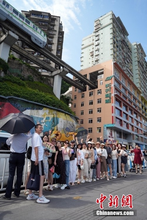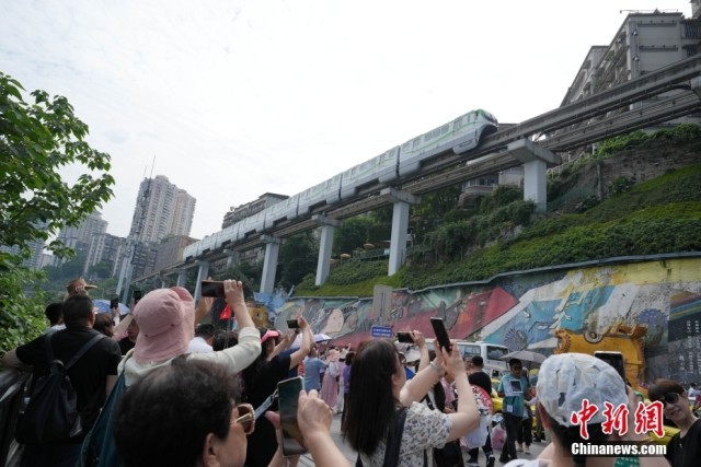 5月14日,游客在重庆市李子坝车站外拍照。重庆市渝中区李子坝站单轨穿楼景象成为当地新的旅游景点,每天吸引来自各地的游客参观、打卡拍照。位于重庆轨道交通2号线的李子坝轻轨站是国内第一座与商住楼共建共存的跨座式单轨高架站,于2004年3月建成。