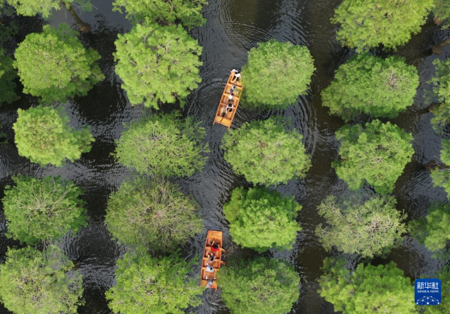 5月26日,游客在江苏省扬州市渌洋湖湿地公园的“水上森林”乘船游览(无人机照片)。