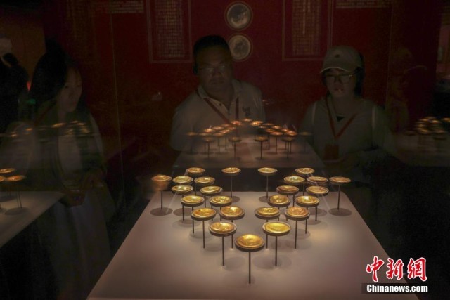 7月17日,江西南昌,民众在南昌汉代海昏侯国遗址国家考古遗址公园内的南昌汉代海昏侯国遗址博物馆参观展出的饼形金。海昏侯刘贺墓出土了478件、重达115公斤的黄金器物,是迄今中国汉墓考古发现黄金数量最多的一次。正值暑期,不少民众走进南昌汉代海昏侯国遗址国家考古遗址公园参观游览。