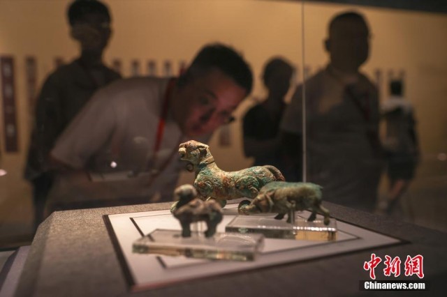 7月17日,江西南昌,民众在南昌汉代海昏侯国遗址国家考古遗址公园内的南昌汉代海昏侯国遗址博物馆参观展出的青铜动物玩具。正值暑期,不少民众走进南昌汉代海昏侯国遗址国家考古遗址公园参观游览。