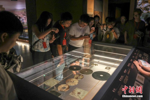 7月17日,江西南昌,民众在南昌汉代海昏侯国遗址国家考古遗址公园内的南昌汉代海昏侯国遗址博物馆参观展出的玉璧、玉片饰等文物。正值暑期,不少民众走进南昌汉代海昏侯国遗址国家考古遗址公园参观游览。