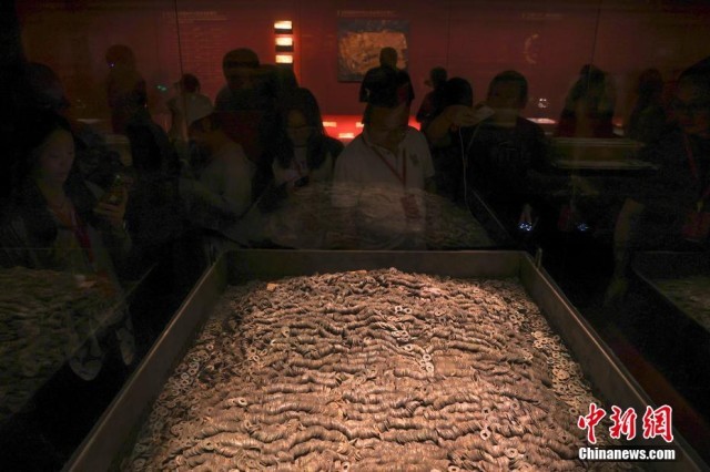 7月17日,江西南昌,民众在南昌汉代海昏侯国遗址国家考古遗址公园内的南昌汉代海昏侯国遗址博物馆参观展出的大量五铢钱。正值暑期,不少民众走进南昌汉代海昏侯国遗址国家考古遗址公园参观游览。