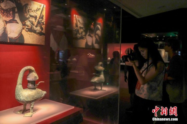7月17日,江西南昌,民众在南昌汉代海昏侯国遗址国家考古遗址公园内的南昌汉代海昏侯国遗址博物馆参观展出的青铜雁鱼釭灯。正值暑期,不少民众走进南昌汉代海昏侯国遗址国家考古遗址公园参观游览。