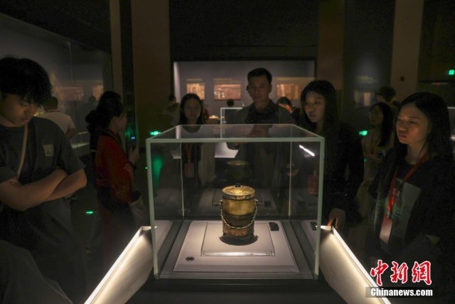 7月17日,江西南昌,民众在南昌汉代海昏侯国遗址国家考古遗址公园内的南昌汉代海昏侯国遗址博物馆参观展出的青铜提粮鋞。正值暑期,不少民众走进南昌汉代海昏侯国遗址国家考古遗址公园参观游览。