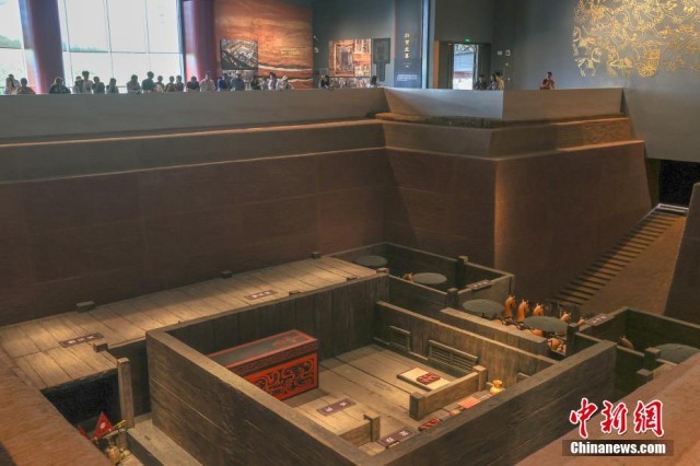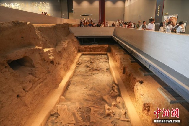 7月17日,江西南昌,民众在南昌汉代海昏侯国遗址国家考古遗址公园内的刘贺墓园参观外藏车马坑。外藏车马坑通过还原车马坑考古发掘时的遗迹场景,让观众身临其境感受考古发掘状态。正值暑期,不少民众走进南昌汉代海昏侯国遗址国家考古遗址公园参观游览。