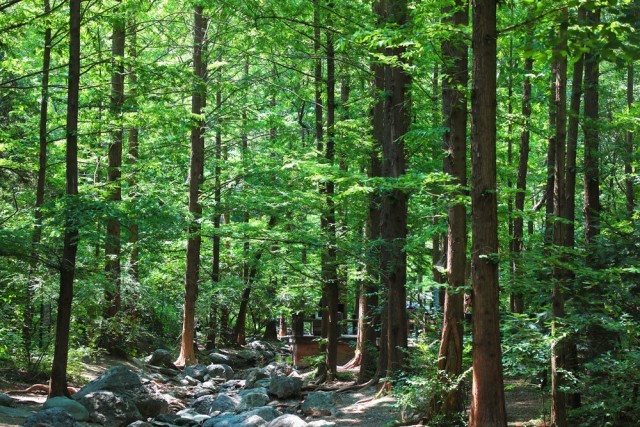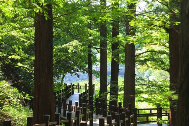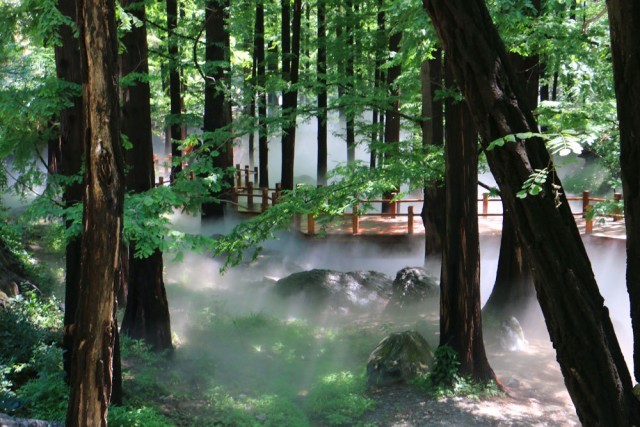 樱桃沟位于国家植物园北园的西北侧,是北京地区的自然保护区,由于这里地处山林、树木葱郁,温度比市区降低了5-6度。延栈道前行,一片高大的水杉林为我们遮蔽了日头,让我们在闷热的夏日里感受到一丝清凉。水杉是中国特有的珍稀濒危植物,是世界上珍稀的孑遗植物,素有“活化石”之称。为了让水杉林能更好的生长,植物园在水杉林景区增设了喷雾系统,不仅提高了该区域空气湿度,改善了生态环境,也造就了一处深受游客喜爱的游览区域。每逢周末水杉林景区喷雾开放的时候,这里更成为了游客最爱聚集的场所。人们漫步在栈道之上,穿行于高大水杉林间,身边不时腾起阵阵水雾,仿佛步入了人间仙境一般,这里也连续三年被评为北京网红打卡地。