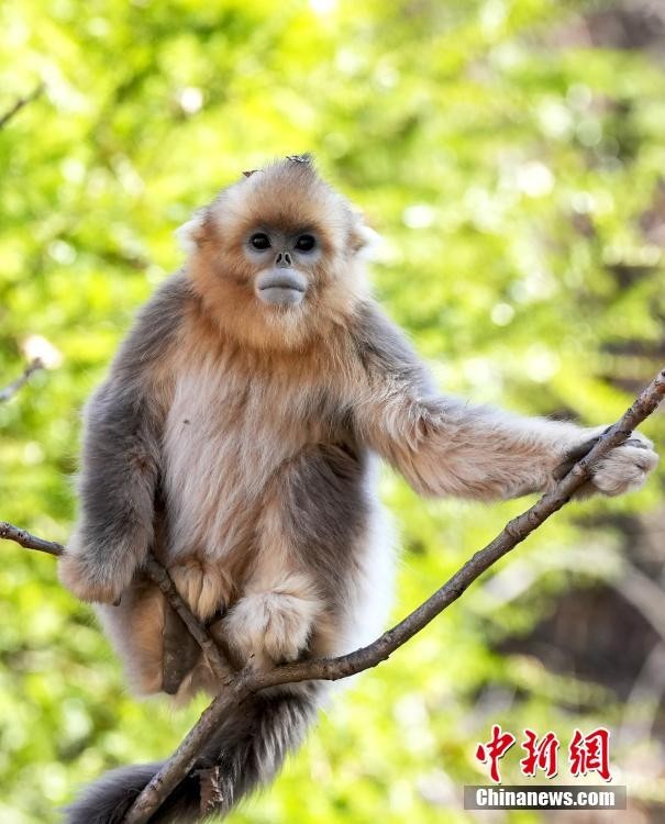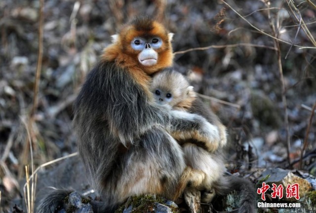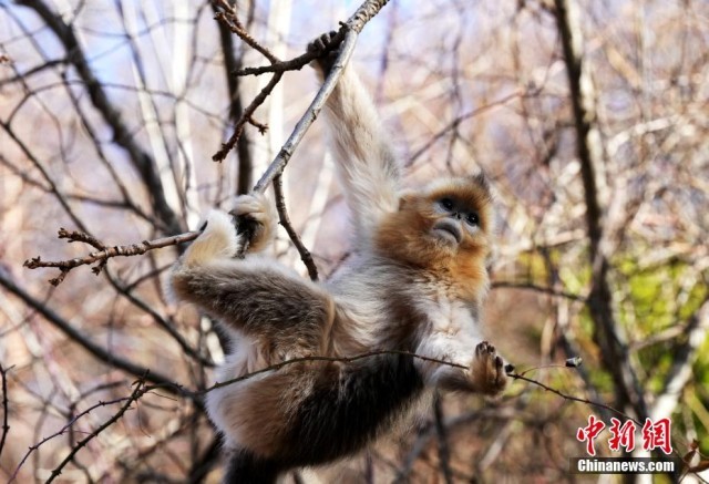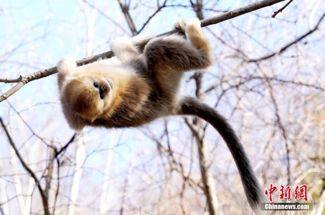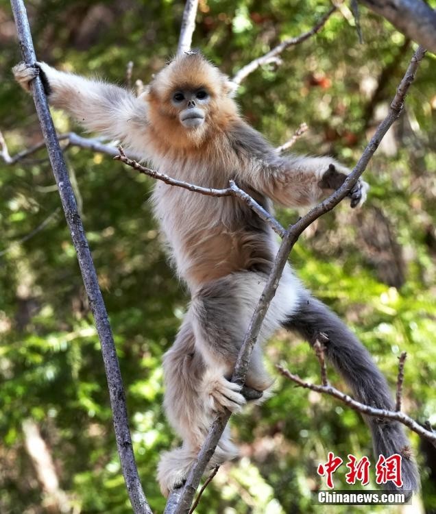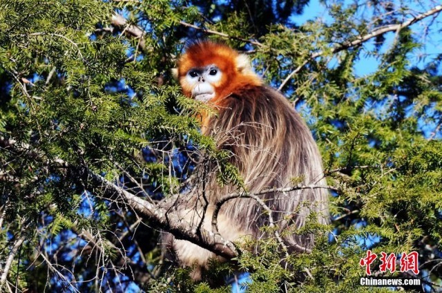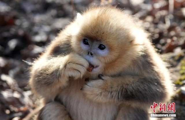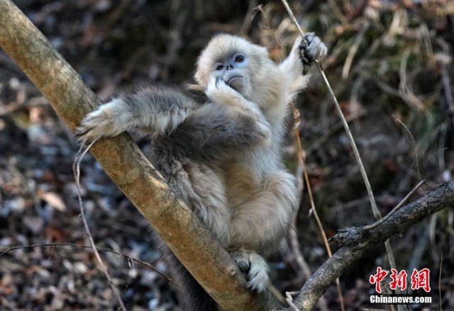 在位于四川省阿坝藏族羌族自治州九寨沟县境内的四川白河国家级自然保护区里,生活着约1700只野生川金丝猴,这些面颊呈淡蓝色,全身金黄、毛发油亮的川金丝猴在层峦叠翠的山林峡谷玩耍,动作轻盈、萌态十足。图为1月16日,野生川金丝猴萌态十足。