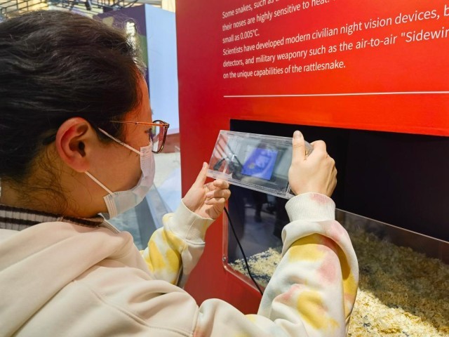 游客在上海自然博物馆里通过红外互动装置了解蛇如何“锁定”猎物。新华社记者 陈爱平 摄