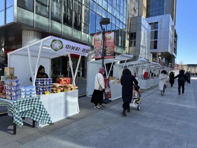 在冰滑梯的西北侧,15个展棚一字排开,记者看到,这里是“冰”纷壹号·超燃冰雪季的园区商户推介区,15家商户在展棚里向大众展示自己的美食商品和文创产品,吸引了众多科技工作者和周边居民前来选购,进一步推动了园区内商业发展,促进消费增长。