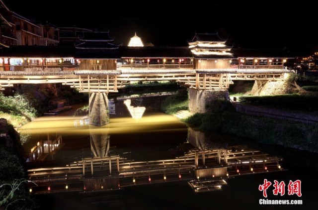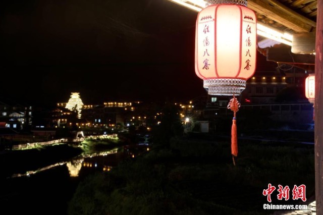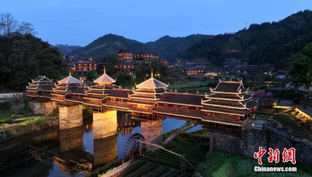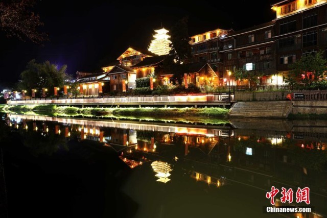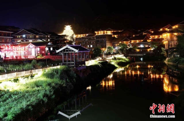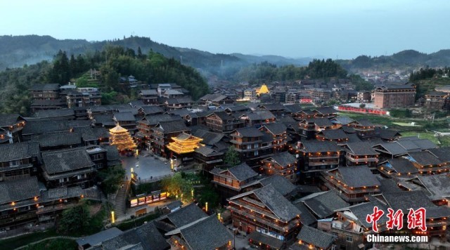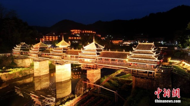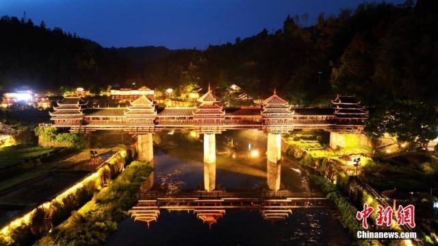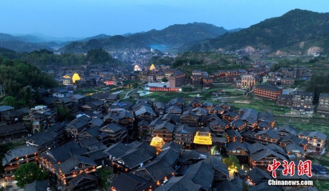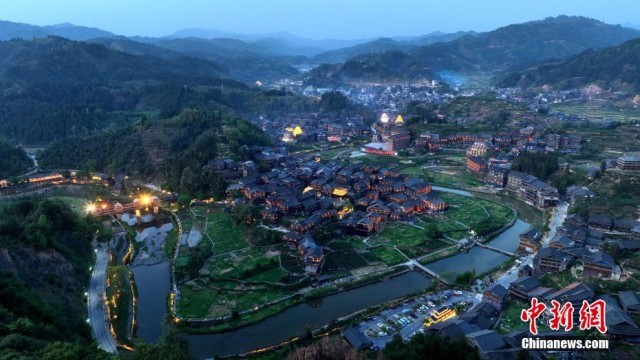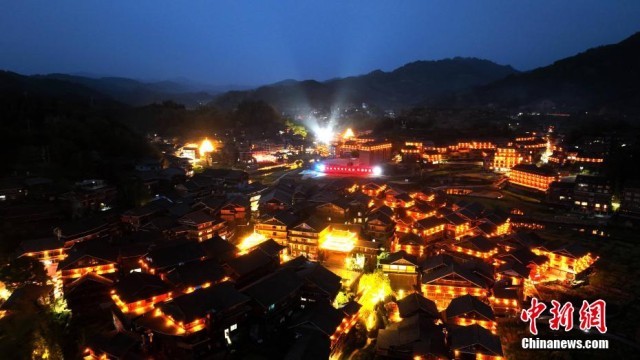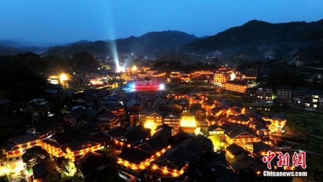 4月16日晚,广西三江侗族自治县林溪镇程阳八寨景区璀璨夺目,全新亮化系统点亮夜空,古朴侗寨与苍翠山峦、潺潺溪流交相辉映,勾勒出一幅古韵与光影交融的梦幻画卷。图为航拍广西三江侗族自治县程阳八寨。