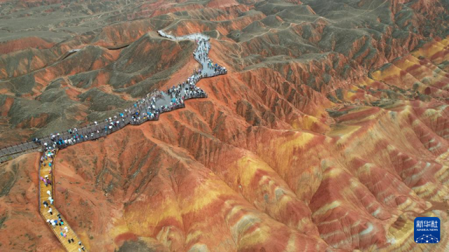 游客在张掖市七彩丹霞景区观赏雨中丹霞(6月22日摄,无人机照片)。
