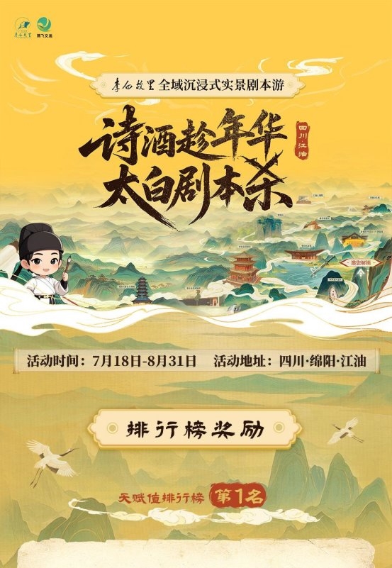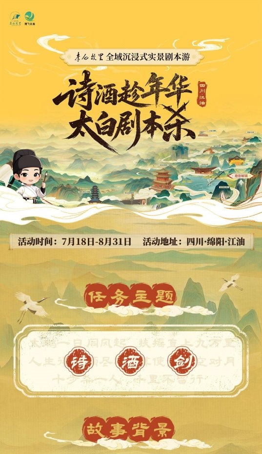 号外号外!“诗酒趁年华·太白剧本杀”全域沉浸式剧本游将于明日上线!7月18日至8月31日,一场席卷江油的盛唐幻梦即将成真……在这里,唤醒“诗仙”魂,寄情山水间。在这里,万元奖励、景区年卡等你来拿!你是不是也心动了呢?今日,这份通关秘籍请查收!