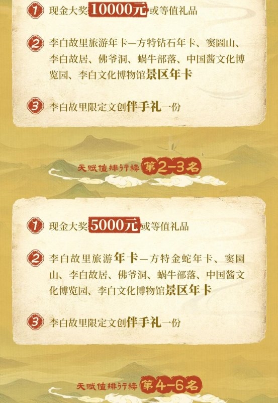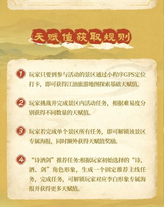 玩家在太白堂前参与“李白喊你来飙诗”全民诗词盛典海选活动,参与即可获得基础天赋值;如参加初赛,入围决赛可获得额外天赋值。