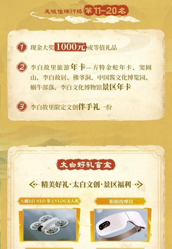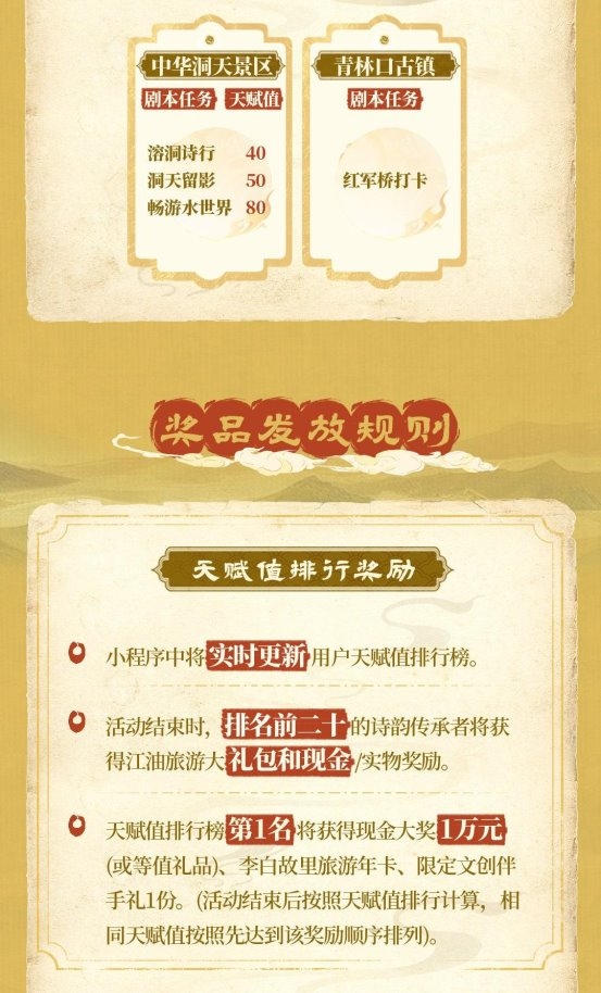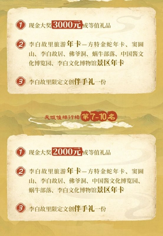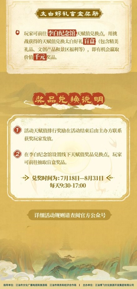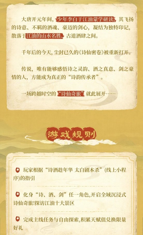 本次挑战分为“诗”“酒”“剑”三条主题路线,玩家可根据“诗酒趁年华太白剧本杀”(线上小程序)的提示完成挑战积累天赋值。天赋值越多,奖品越丰富!(*具体天赋值以小程序及现场规则为准)