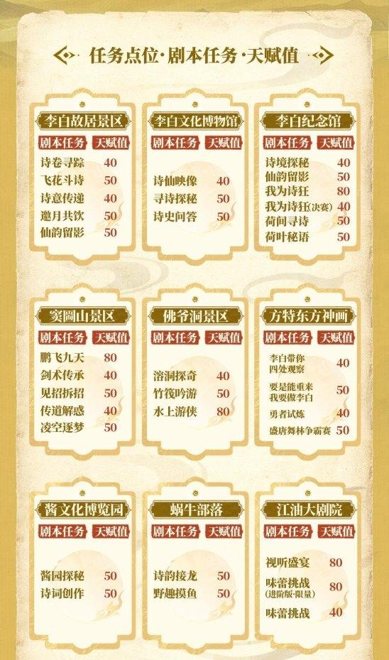 玩家游览博物馆,探寻诗仙生平,在博物馆序厅内找到工作人员进行限时快问快答挑战,1分钟内答对3道李白生平/诗词问题,可获取天赋值。