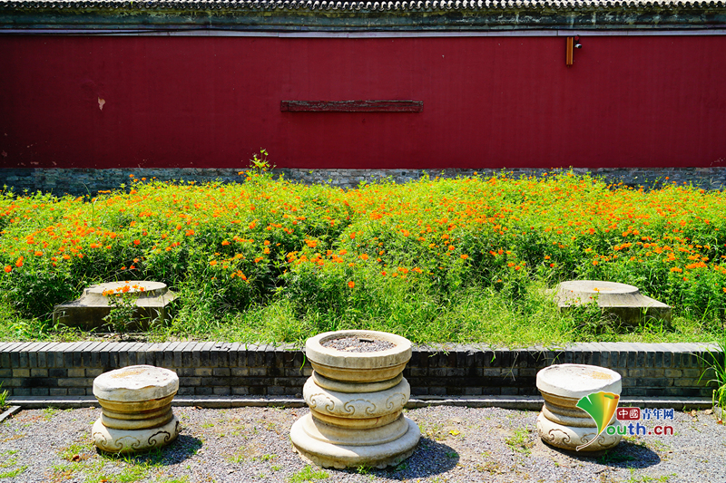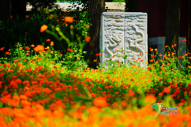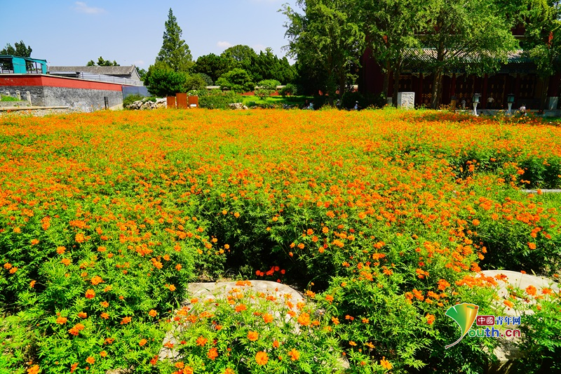 8月11日,北京,北海公园硫华菊进入盛花期,橘色花海与万佛楼古建筑群交相辉映,美不胜收。