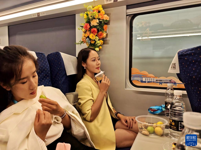 9月20日,旅客在中老铁路列车上品尝咖啡。