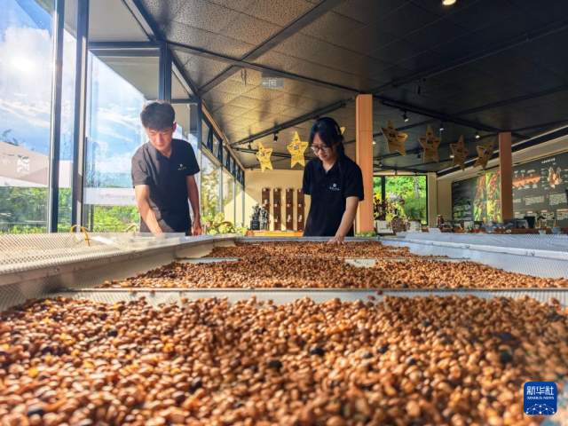 9月20日,普洱市思茅区南屏镇南岛河村白沙坡小组的“美丽星村·有风咖谷”工作人员在展示咖啡豆的处理过程。