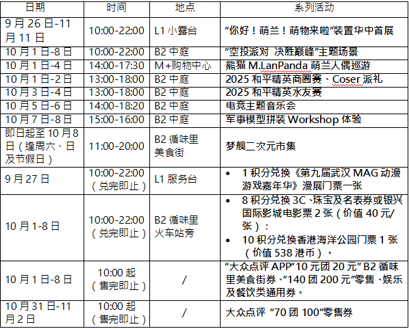 活动期间,M+推出五大促销活动,邀您共享双节钜惠。9月27日,M+会员凭1积分兑换《第九届武汉MAG动漫游戏嘉年华》漫展门票一张;10月1-8日,“大众点评APP“10元团20元” B2循味里美食街券、“140团200元”零售、娱乐及餐饮类通用券,还有会员积分畅兑,M+会员凭8积分兑换3C、珠宝及名表券或银兴国际影城电影票2张(价值40元/张);10积分兑换香港海洋公园门票1张(价值538港币)。10月31日-11月2日,奇趣狂欢派对,大众点评“70团100”零售券。超值限量上线,特惠狂暴来袭,尽享吃喝玩乐、购物福利。