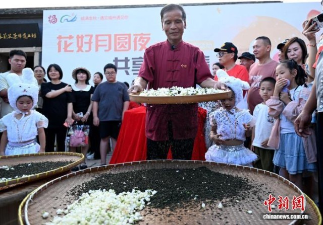 10月5日,“花好月圆夜 共享邻里情”中秋民俗活动在福州市仓山区梁厝特色历史文化街区举办。活动现场文艺表演、猜灯谜、摆塔、月饼分享、拜月仪式等环节轮番上演,为市民、游客带来了一场沉浸式的中秋文化盛宴。图为市民、游客观看茉莉花茶窨制工艺演示。中新社记者 吕明 摄