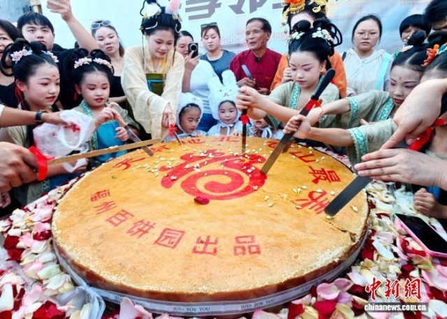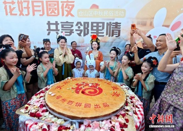 10月5日,“花好月圆夜 共享邻里情”中秋民俗活动在福州市仓山区梁厝特色历史文化街区举办。活动现场文艺表演、猜灯谜、摆塔、月饼分享、拜月仪式等环节轮番上演,为市民、游客带来了一场沉浸式的中秋文化盛宴。图为巨型月饼亮相活动现场并与众人分食。中新社记者 吕明 摄