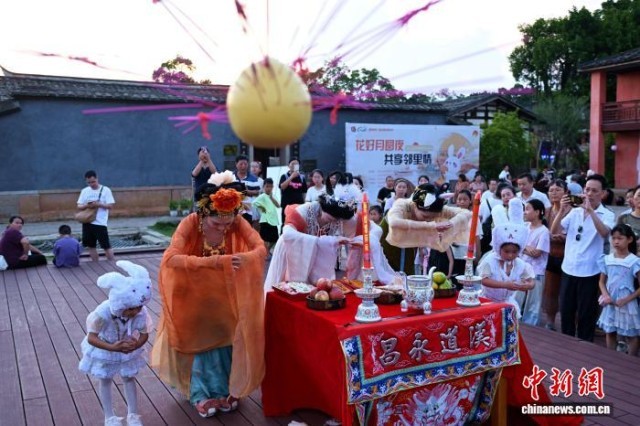 10月5日,“花好月圆夜 共享邻里情”中秋民俗活动在福州市仓山区梁厝特色历史文化街区举办。活动现场文艺表演、猜灯谜、摆塔、月饼分享、拜月仪式等环节轮番上演,为市民、游客带来了一场沉浸式的中秋文化盛宴。图为中秋拜月仪式。中新社记者 吕明 摄