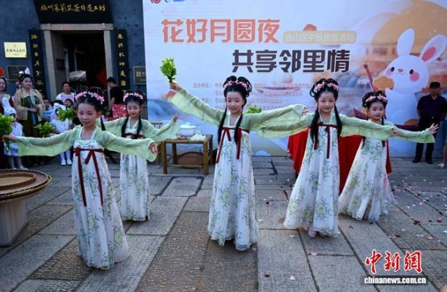 10月5日,“花好月圆夜 共享邻里情”中秋民俗活动在福州市仓山区梁厝特色历史文化街区举办。活动现场文艺表演、猜灯谜、摆塔、月饼分享、拜月仪式等环节轮番上演,为市民、游客带来了一场沉浸式的中秋文化盛宴。图为舞蹈表演。中新社记者 吕明 摄